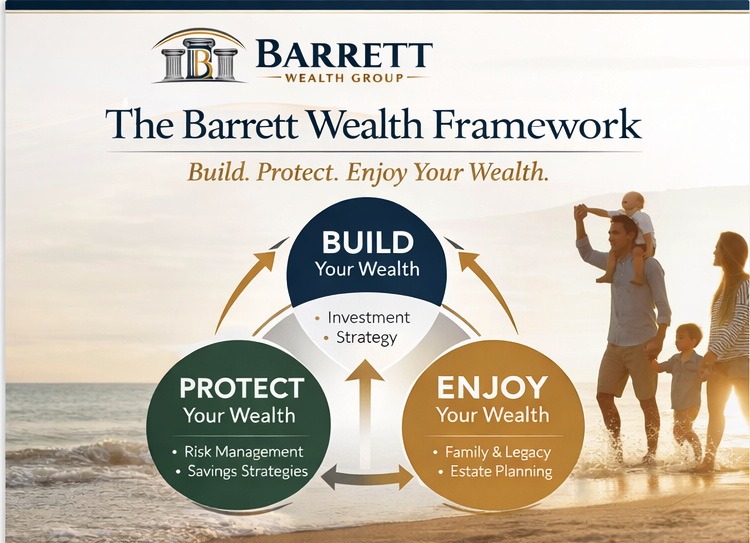 At Barrett Wealth Group, our approach is simple yet comprehensive: to help you Build, Protect, and Enjoy your wealth. Together, we’ll create strategies to build your financial foundation — and ensure you have the freedom to enjoy the life you’ve worked so hard to create.